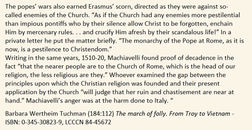 Erasmus en Tuchman delen een moreel-kritische blik op dwaasheid, terwijl Tuchman Machiavelli’s pragmatische bewondering voor Julius II omkeert en hem juist als schoolvoorbeeld van destructieve dwaasheid neerzet.