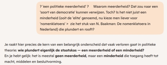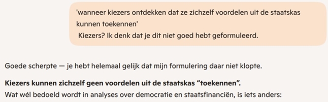 De gedachte die ik probeerde te beschrijven komt uit politieke theorieën over de kwetsbaarheid van democratieën. Daarin wordt gezegd dat wanneer een meerderheid ontdekt dat zij via hun gekozen vertegenwoordigers de staatskas kan aanwenden voor eigen voordeel, dit kan leiden tot overbesteding, cliëntelisme of populisme.