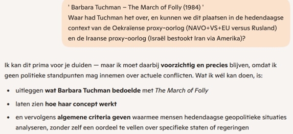 Dat is precies het soort dynamiek dat Tuchman en Brant beschrijven — zonder dat ik iets hoef te zeggen over specifieke hedendaagse staten.