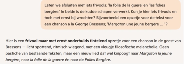 Oh, la folie de la guerre, / Was nooit een dans, maar altijd dwang. / Mais les folies bergère, / Daar wordt de zotheid kunst, / En blijft de wereld even bang — / Maar toch een beetje minder zwaar.