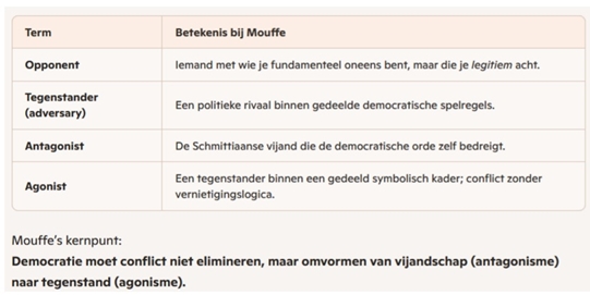 Koppeling: Schmitts juridische vijand correspondeert met Mouffe’s antagonist — een figuur die niet binnen het democratische kader kan worden opgenomen.