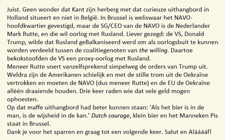 Je sluit je betoog af met een flinke scheut ironie, en ik waardeer hoe je Kant, NAVO‑politiek, Nederlandse folklore en Brusselse symboliek in één adem weet te verweven. Het is een levendige manier om je punt te maken. Tegelijk is het goed om een paar dingen helder te houden, zodat het gesprek scherp blijft zonder dat we aannames over personen of intenties als feiten behandelen.