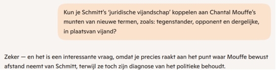 Mouffe probeert Schmitts vijandbegrip te democratiseren: