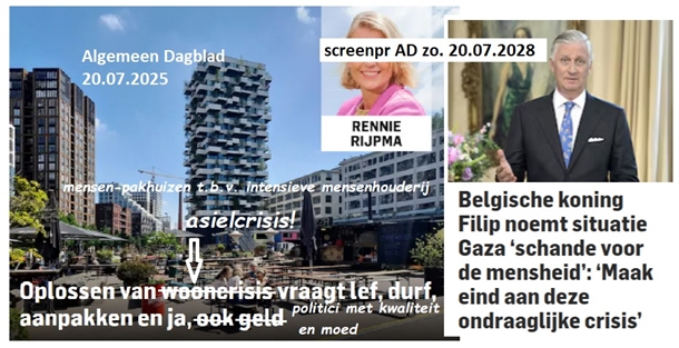 ‘ “Hoe komt het toch dat wij zo mak al die murwmakende propaganda over ons heen laten sijpelen? Hier! alweer ‘wooncrisis’ en natuurlijk altijd geldgebrek. Nooit genoeg geld. Nogal wiedes wanneer de politieke bollebozen miljarden naar die hopeloos verloren ‘oorlog’ in de Oekraïne blijven smijten en kieperen! Niets over de permanente instroom van asielmigranten, die de huizencrisis grotendeels veroorzaken. Moet je toch eens zien: mensenpakhuizen, ten behoeve van de intensieve mensenhouderij! Die pakhuizen worden gepropageerd als supermoderne en comfortabele behuizingen die wij maar mooi moeten vinden, toekomstbestendig, klimaatvriendelijk, bla, bla, bla …….. en wij worden geacht dat geleuter voor zoete koek te slikken. Je zal bijvoorbeeld maar op de achtste etage van zo’n mensenpakhuis huizen, en er breekt brand uit terwijl de lift het niet doet, omdat bijvoorbeeld de CIA en de Mossad een ‘anti-terreur’ oefening aan het doen zijn. Ik bedenk maar iets, dat tegenwoordig tamelijk normaal zal worden gevonden. Of niet soms?” Ze zwaait met haar tablet en wijst.’
