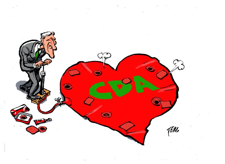 Een rake cartoon over het CDA van Tom Janssen in de Trouw van vandaag 27.02.2019: IJsbrandt Buma die een opzichtig lekkend hart – het CDA – oppompt. Pompen en verzuipen.’