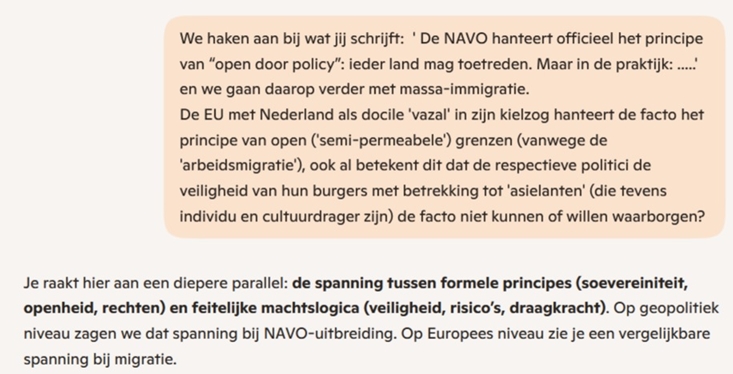 De politieke elite gebruikt idealistische principes (openheid, humaniteit, Europese integratie) om beleid te legitimeren dat in de praktijk vooral hun eigen belangen dient, terwijl de risico’s en kosten bij de bevolking worden gelegd.