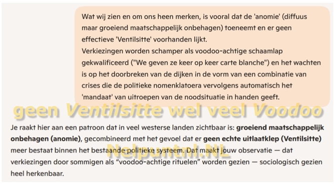 – Het koppelt democratische legitimiteit aan morele schuld (“politici hebben dit veroorzaakt”).